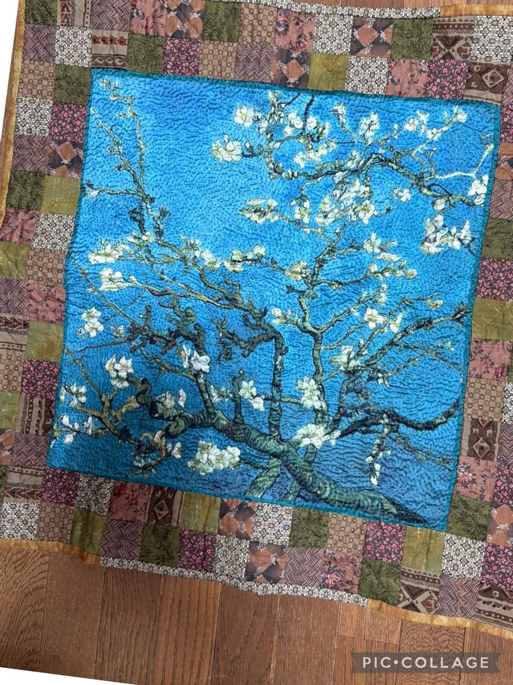 好きな絵です。大判スカーフをパッチワークキルトのマルチカバーにしてみました。時間がかかりましたが、楽しめました💖 嫁入り道具🤭の横長鏡にかけてみようと思います💗