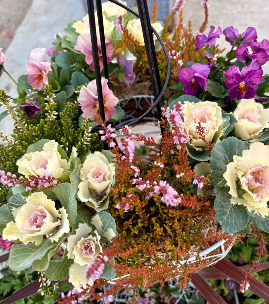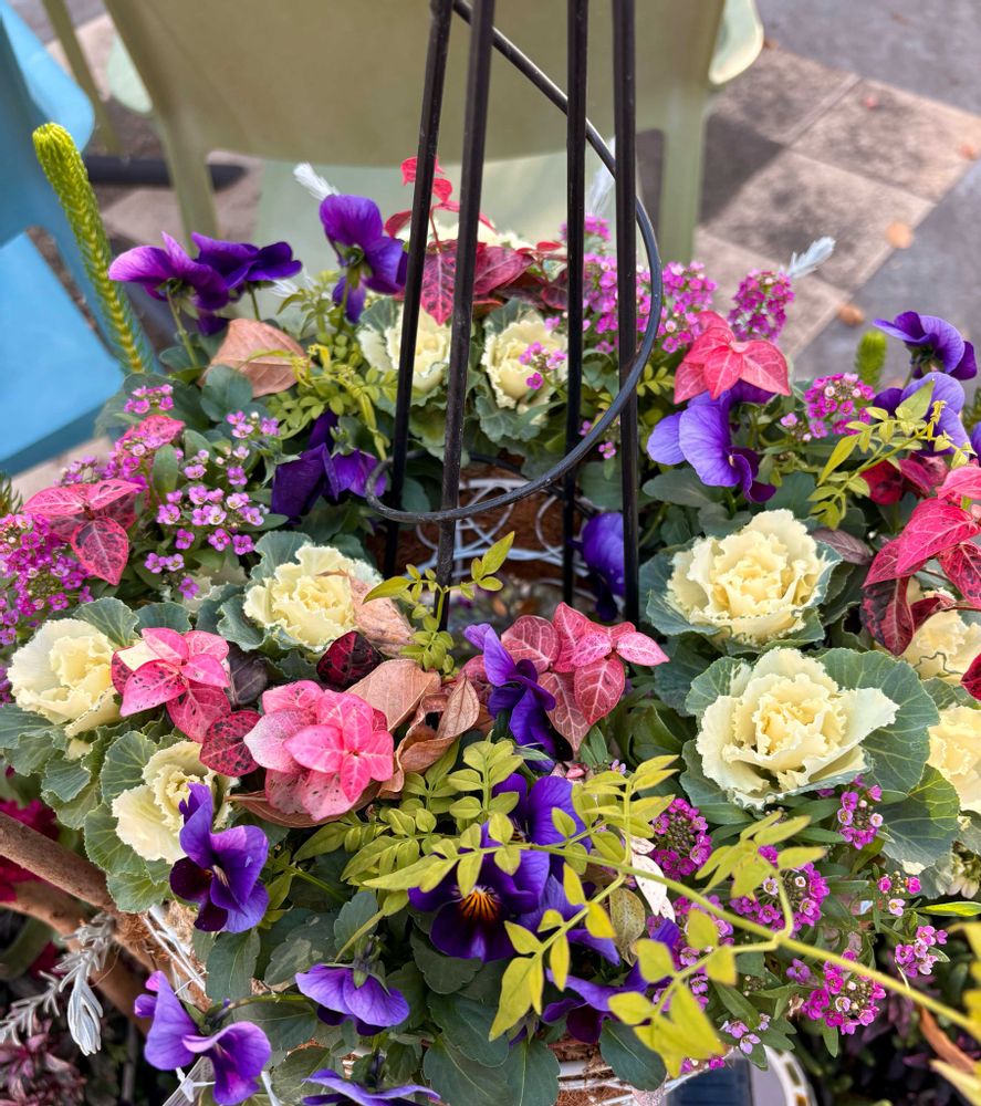 出かけた先で、植物、資材を取り扱っている店先に『ハンギングリース』の寄せ植えが、黒の鉄製の支柱に上から嵌め込まれ植え込みされて綺麗に咲いていました。🙂
