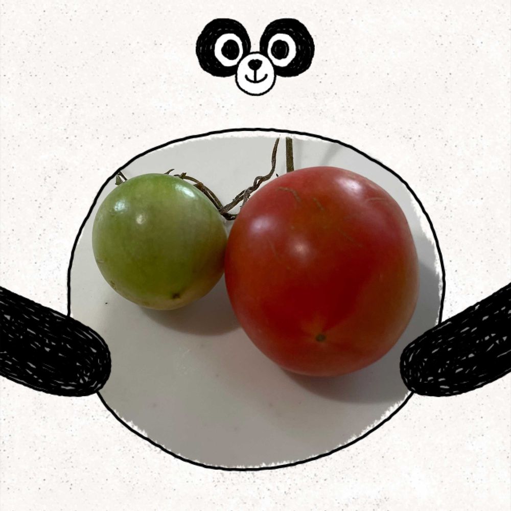トマトちゃんやっと赤くなってきたよ😋🍅片方はだめかな😅