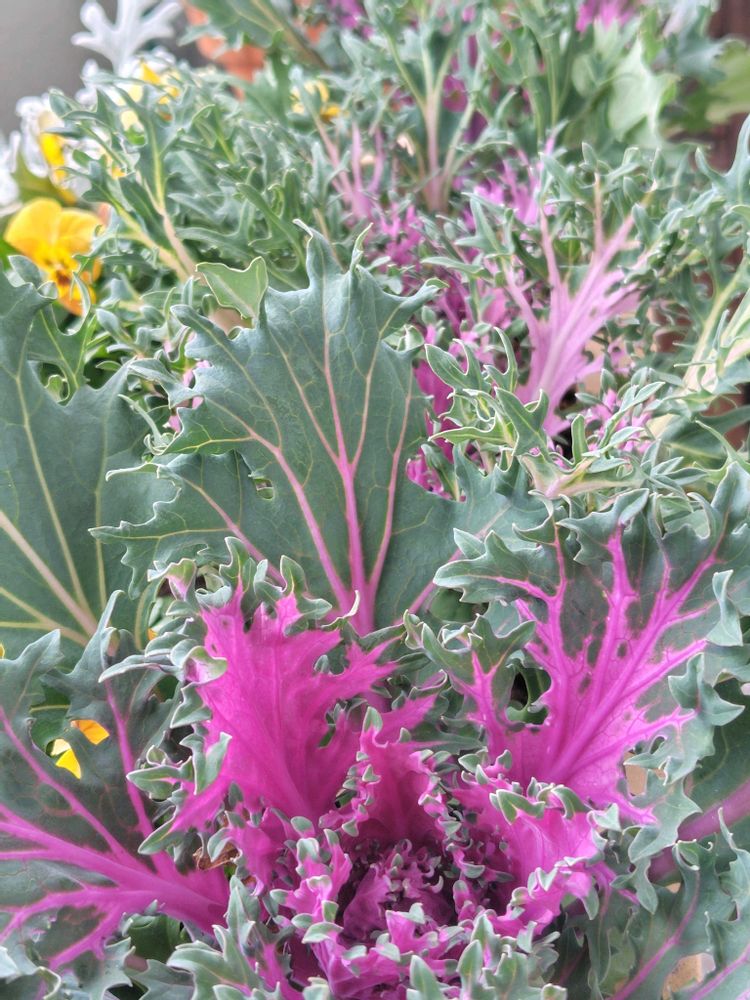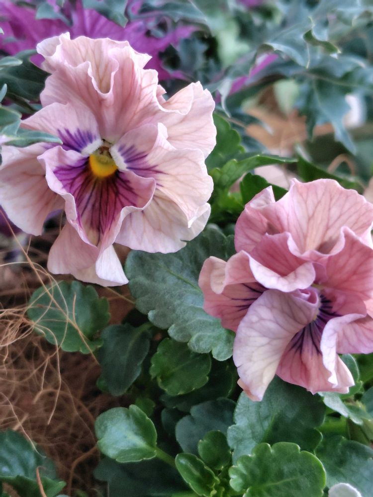 ③④⑤葉牡丹と寄せ植えのパンジー天の羽衣…今年のうえたさんのパンジーはアプリコットカラーとピンクの2色をチョイス🥰 モリモリになるはずです🤭 種蒔きからの葉牡丹の色合いが素敵になって来ました😉