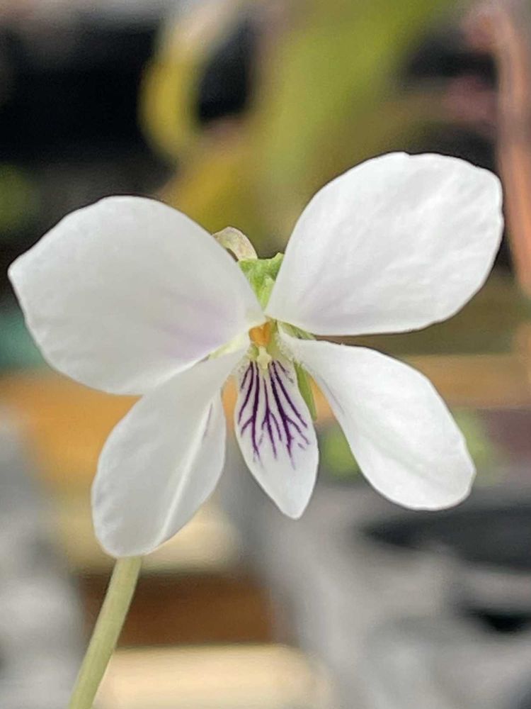 1枚の花びらだけに入った紫の脈のような模様が白さを引き立てているような…素敵なスミレですね💕