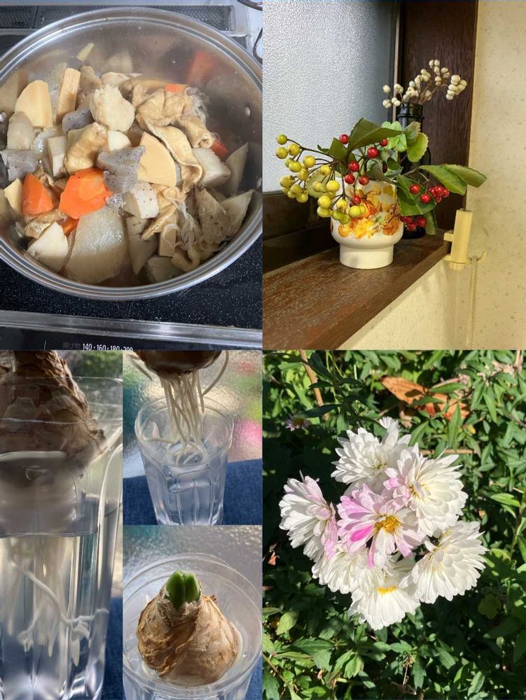 左下、ヒヤシンスの水耕栽培(根も芽も🌱出て来ました💛色)
