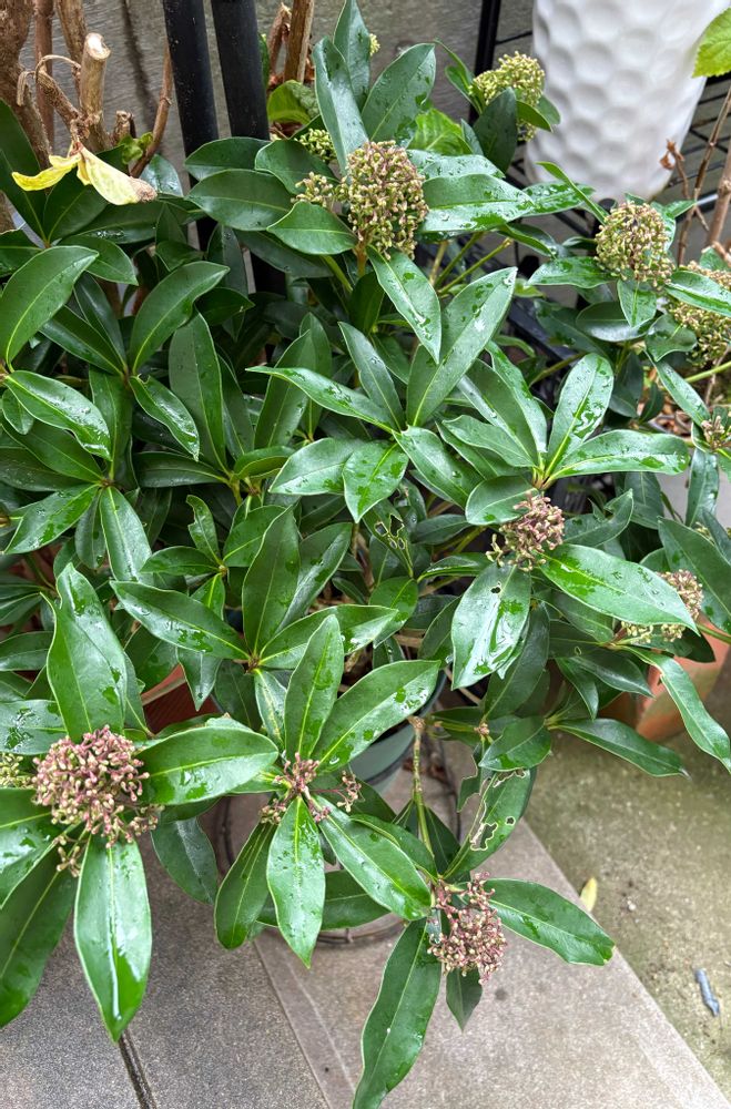 3枚目 お正月寄せ植えに入っていたお正月明けにお手頃価格でお迎えして5年目くらいのスキミア