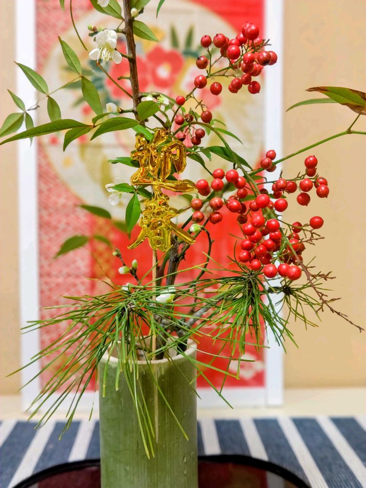 今日のお花🏷️のナンテン。竹筒に松・梅・南天。