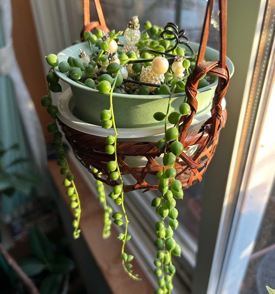 グリーンネックレスちゃんは寒さに強くてお外にもぶら下がりです