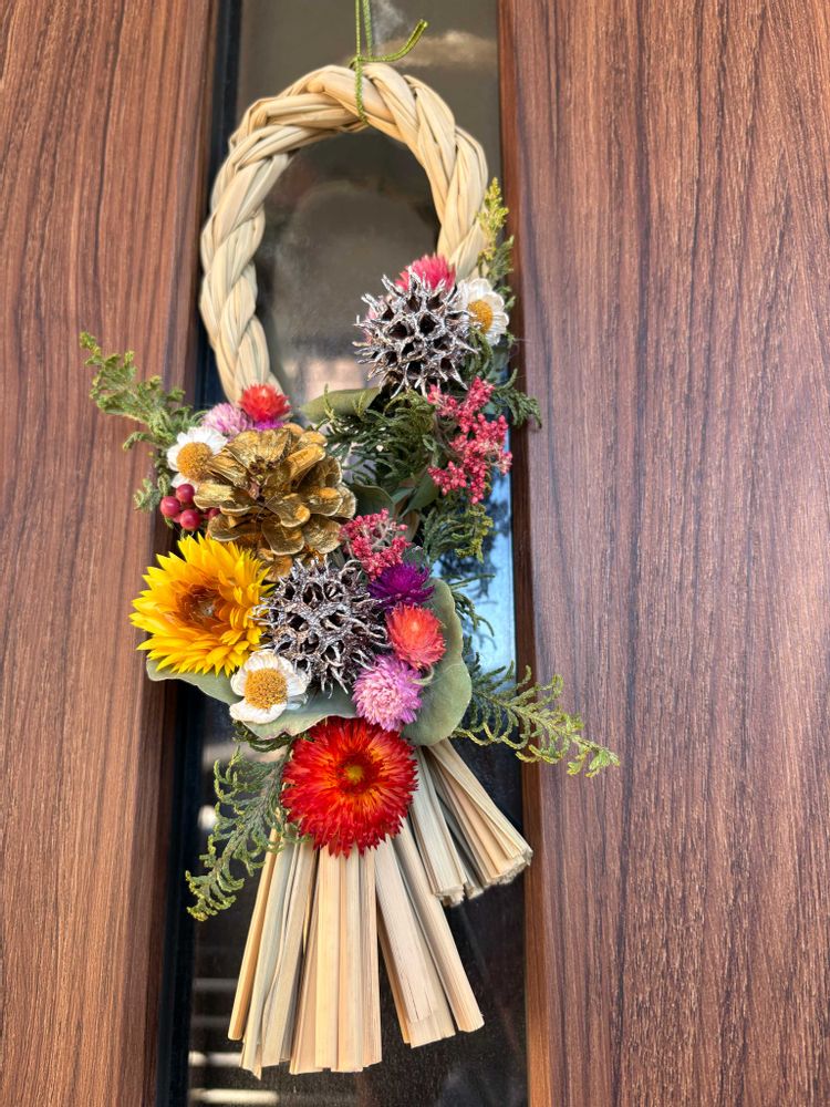 今年のお正月飾りは、クリスマスの時の素材で、残っていた物も使って和洋折衷になりました😅