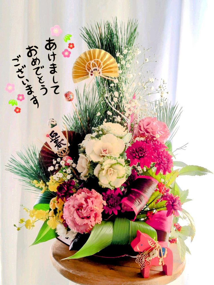 花材は 松、トルコキキョウ、千両、ハラン、ドラセナ、かすみ草、菊、オンシジューム、葉牡丹です。