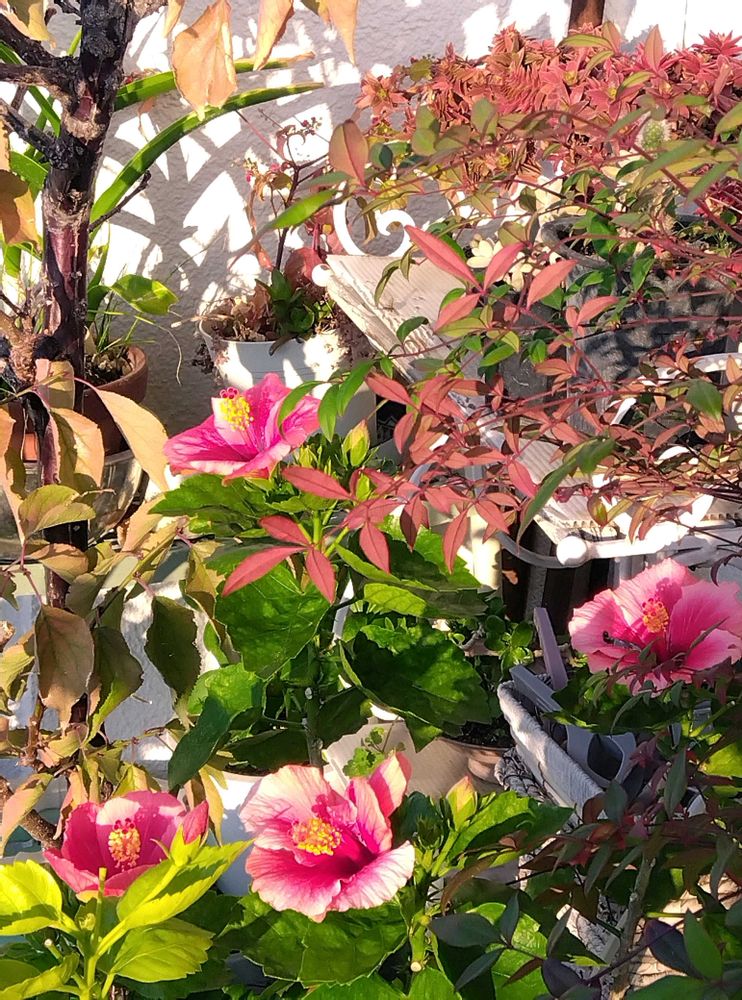 紅葉した紅い葉は我家のベランダにさくハイビスカスとのコラボ