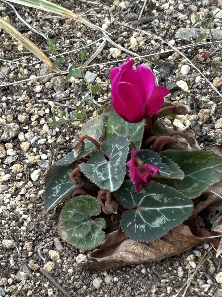 去年の寄せ植えを解体して、ダメ元で庭の木の根元に植えたガーデンシクラメン。ほぼ放置で咲いてくれたたくましい子です。
