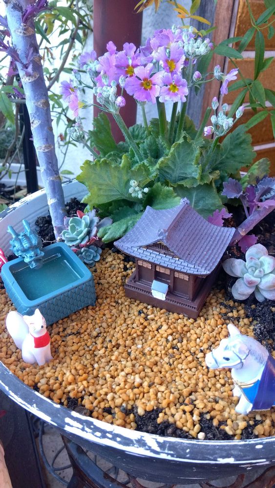 夏越しした葉牡丹に100均で買った神社のオブジェでお正月感🐴✨
