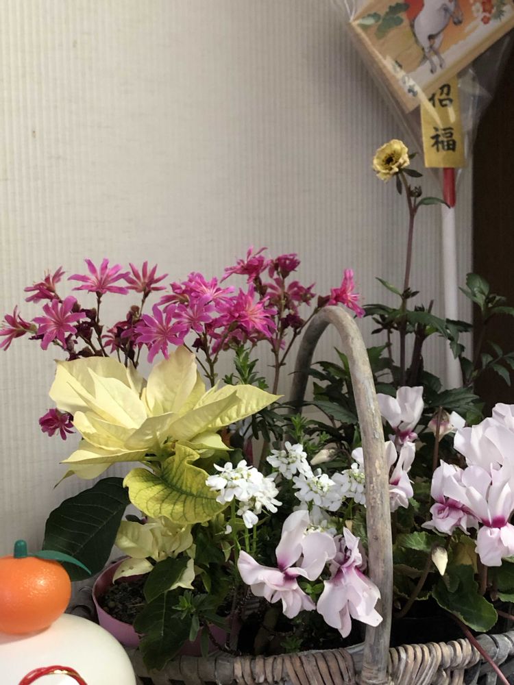 お嫁さんがプレゼントしてくれた花苗を籠盛りして飾りました☺️