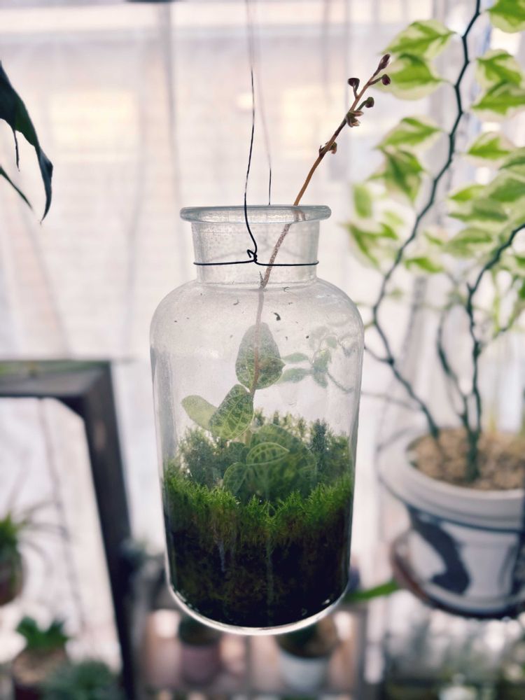 栽培難易度高めと説明されていることも多いけれど、開放型のボトルの中だと換気もしつつ湿度を保てるので、たまに霧吹きしてほったらかしでOK