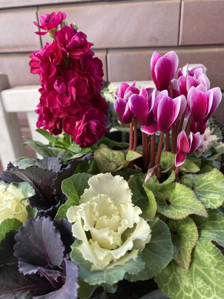 シクラメンとストック、葉牡丹の素敵なお正月の寄せ植えが出来ましたね🎶