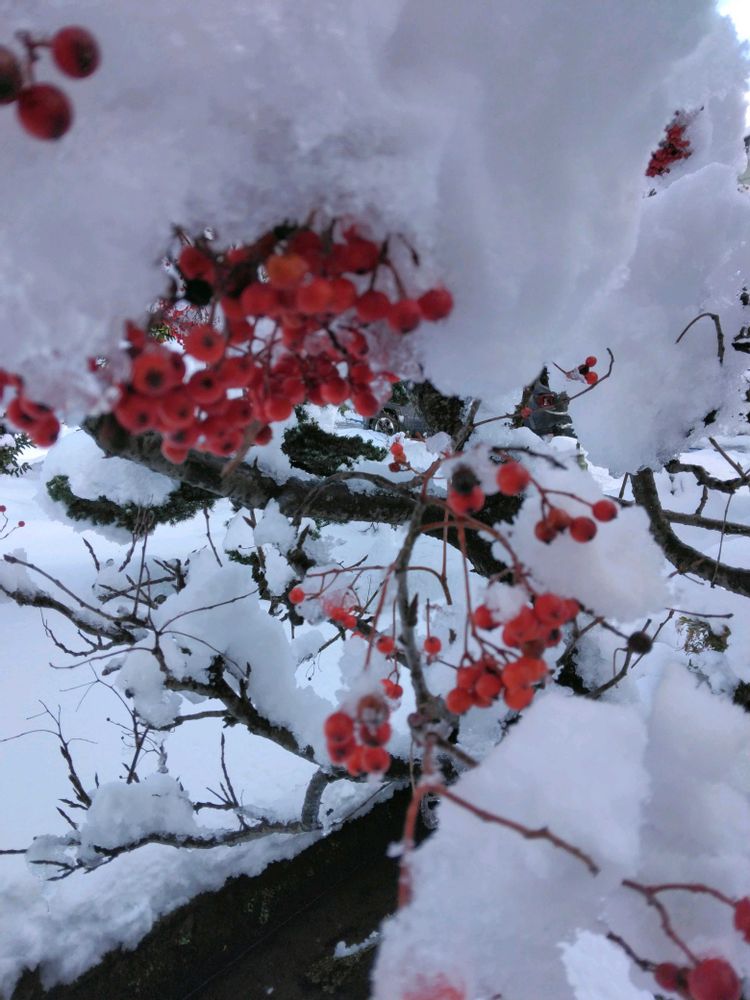 真っ白のぶ厚い、ふわふわ帽子をかぶった、ナナカマドの赤い実が可愛いいです!