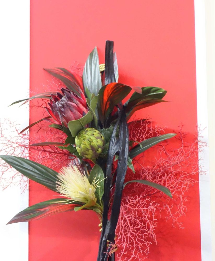 プロテアを使った お正月花新鮮で珍しいと思いましたが、ドームのテーブルウェア展のお花でしたかー🙋♀️