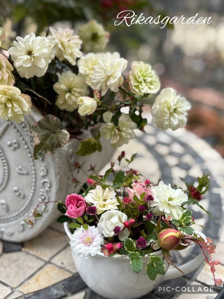 ガーデンテーブルにティーカップのアレンジ☕可愛いですね🩷盛りだくさんなお花たちを見てるだけで癒されます〜小さな蕾にも春を感じますね🌱
