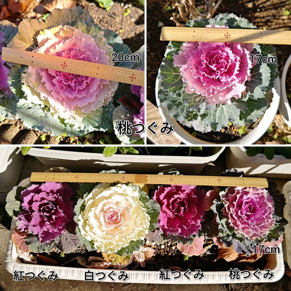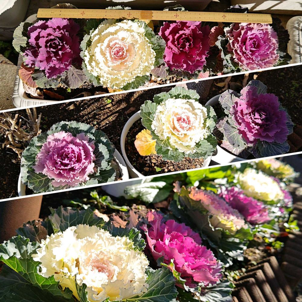 【1枚目】今季唯一の矮性葉牡丹のつぐみミックスは、上段から65cmプランターに4株植え、8号ビオラ鉢に1株植え、地植えと、様々な株間で育ててみました。
