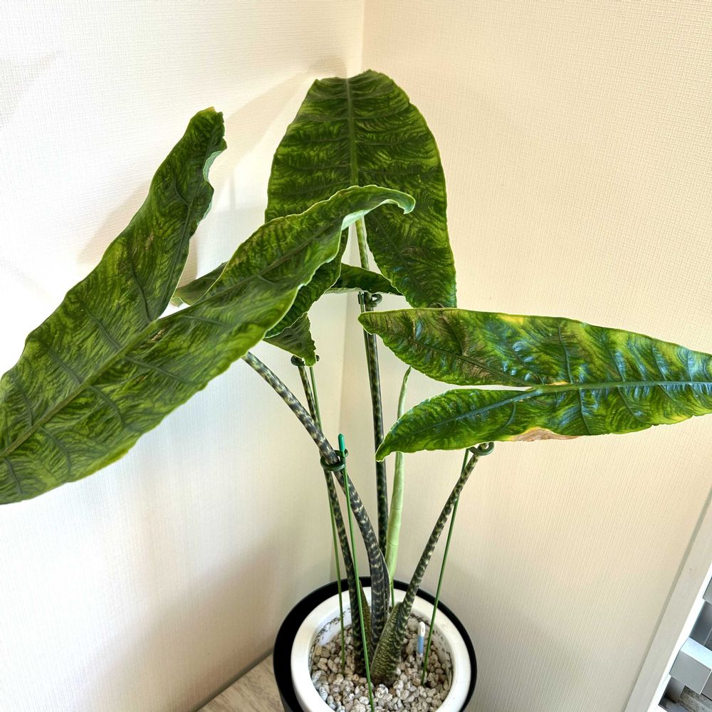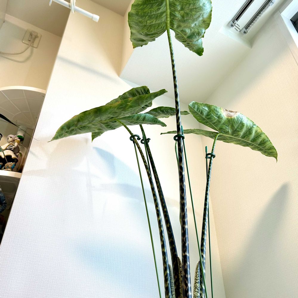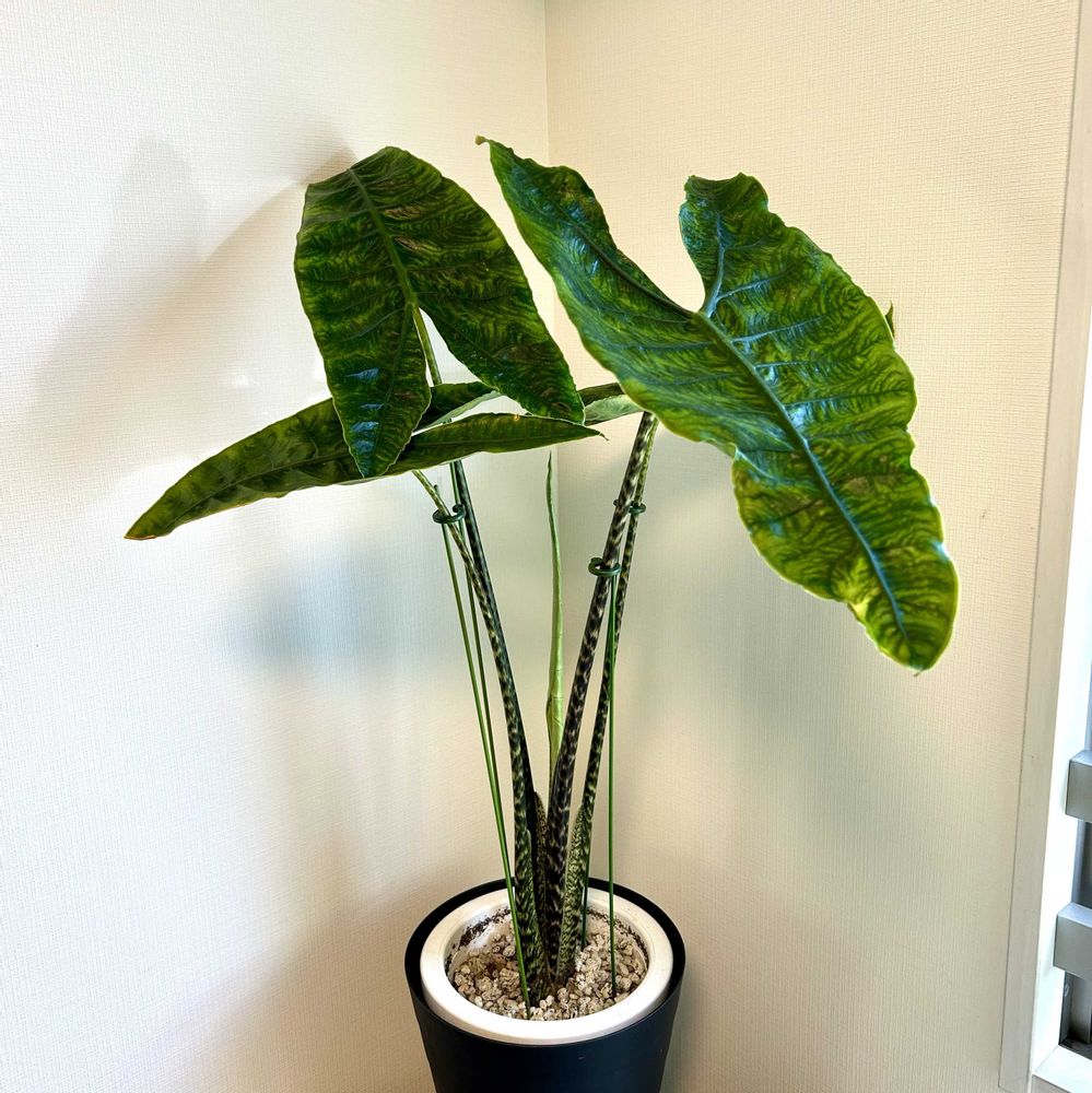 アロカシアゼブリナアティキュラータ😊茎のゼブラ模様と葉っぱのジュラシック感に一目惚れ🤩です〜