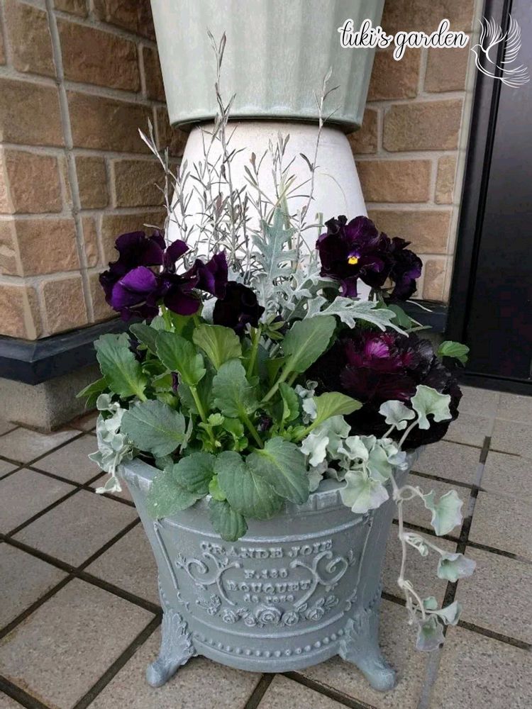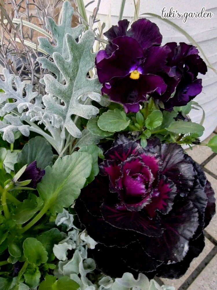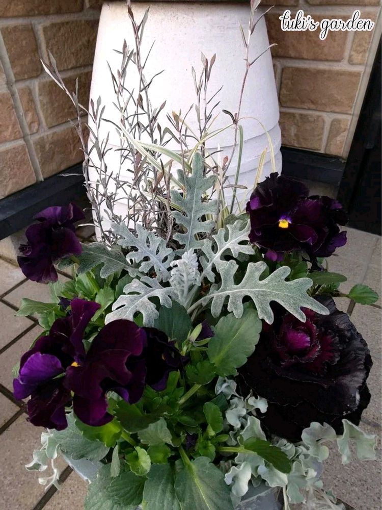 サトウ園芸さんのパンジー『シュバリエ・ドゥ・リュンヌ』を使ったカッコいい寄せ植えを作りたくて、黒い葉牡丹とグレーやシルバーのリーフ類を合わせてみました。