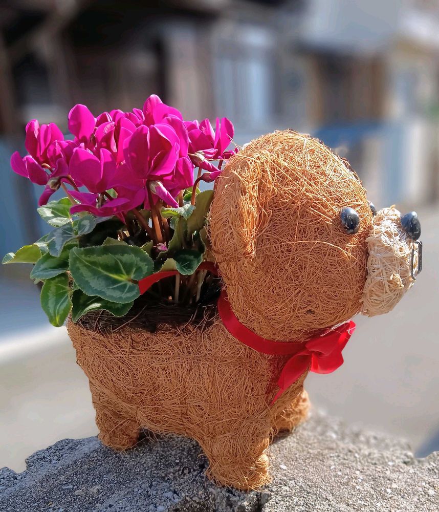 昨年の母の日にもらったカーネーションが入っていた鉢カバー🐶にシクラメンを入れてみました😊