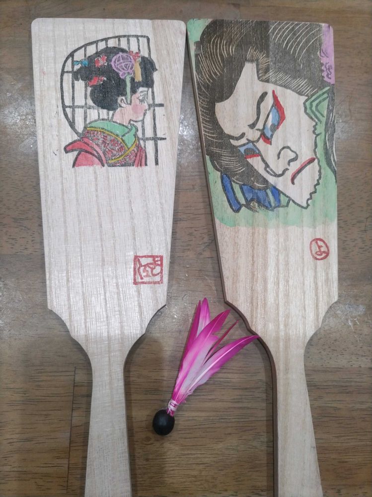 浅草で買った何も描いてない羽子板。以前彫った消しゴムハンコを押してみた。