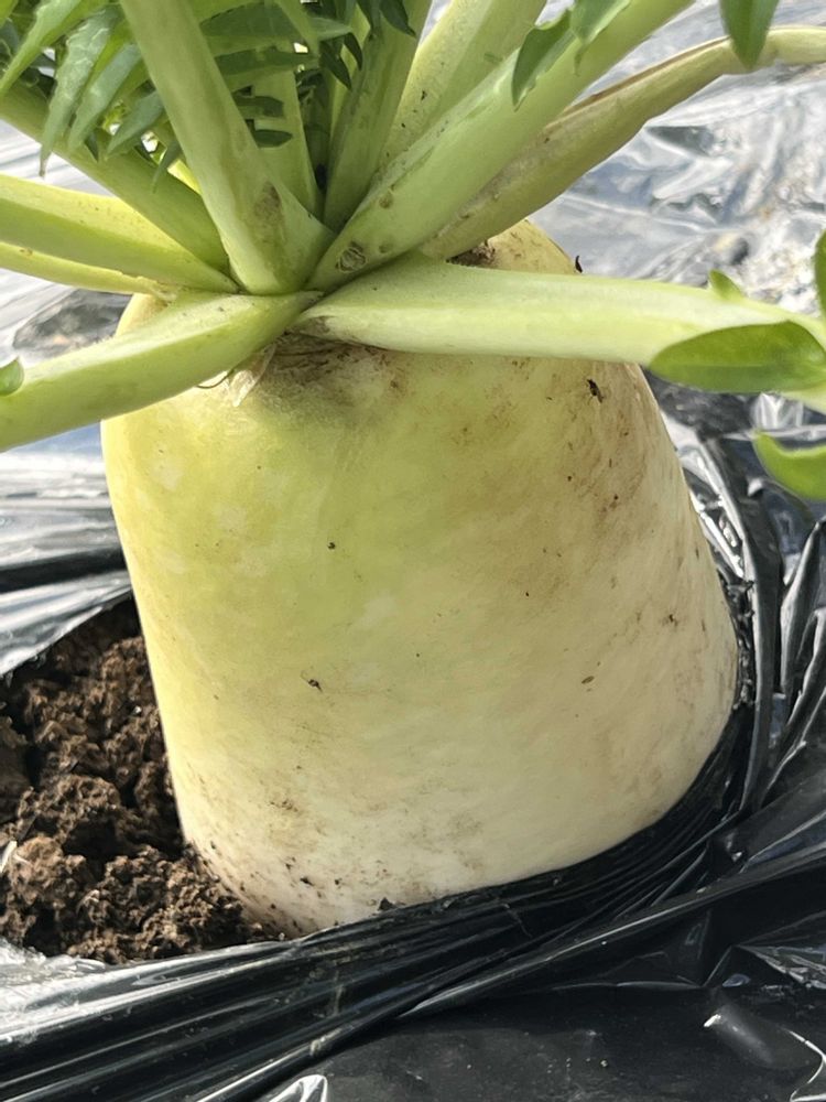 畑の赤大根、白いおでん大根が私の足より太い