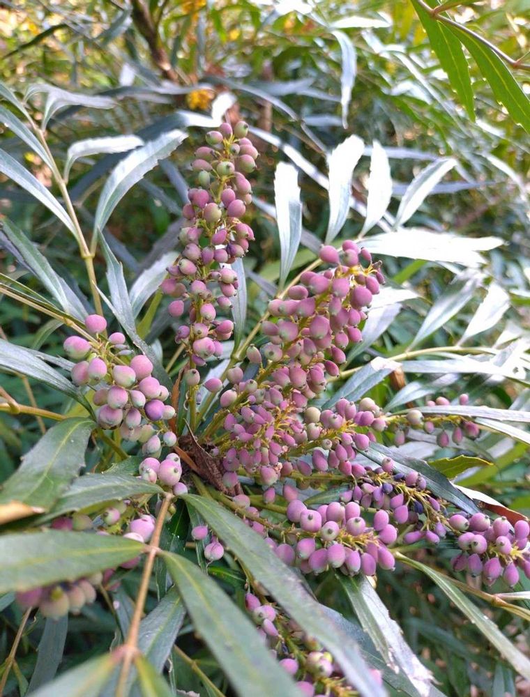 メギ科ヒイラギナンテン属の常緑低木。中国原産で明治時代初期に渡来したといわれる。高さ1〜2mになる。葉は奇数羽状複葉。葉柄の基部はさや状になって基部を抱く。小葉は2〜4対あり、長さ7〜13㎝の狭長楕円形で、先は尖る。縁には浅い鋸歯があり、鋸歯の先は針状に尖る。花期は9~10月。茎の先から長さ5〜6㎝の総状花序を数個出し、黄色の小さな花を多数開く。花弁は6個で裂けない。果実は直径約5㎜のほぼ球形で、翌年の2〜3月に藍黒色に熟す。