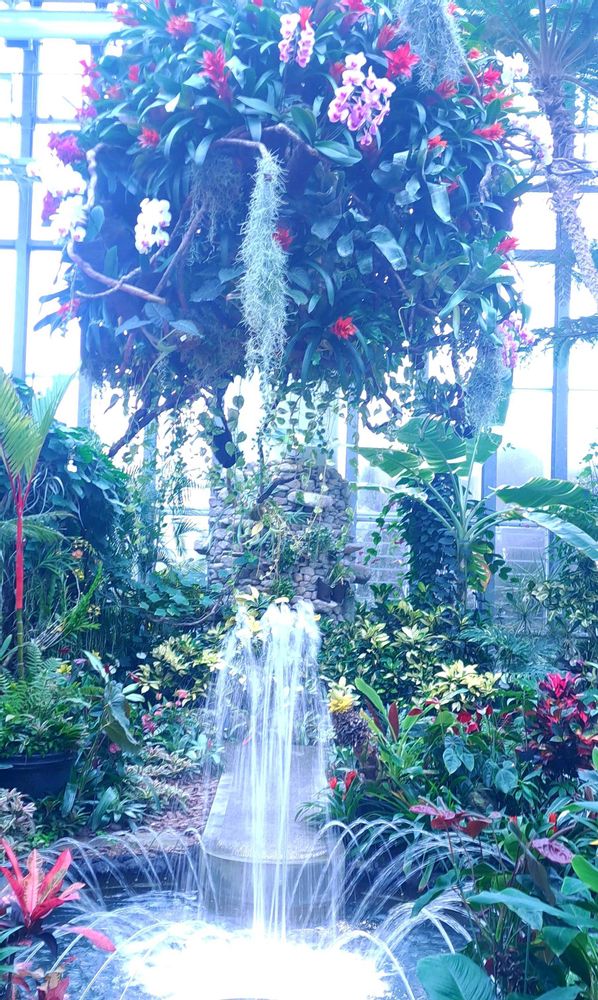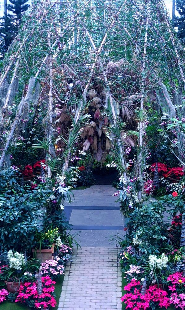 ④枚目…「しきさいのにわ」の噴水⛲の上には赤いグズマニア、胡蝶蘭他でコーディネートされた「フラワーシャンデリア✨️💖」