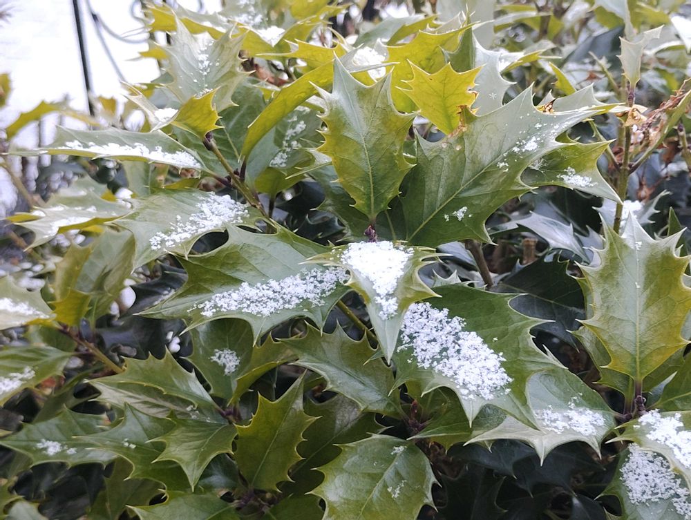 夜に少し雪が降ったようで、玄関先のヒイラギに雪が少し積もっていました