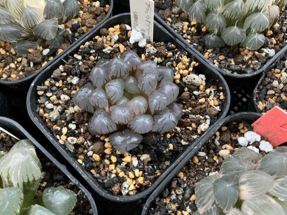 交配種ということで、確かにブラックオブツーサほど黒くならないような。窓も丸いしね。赤紫っぽい感じなのは自分好みです٩( 'ω' )و