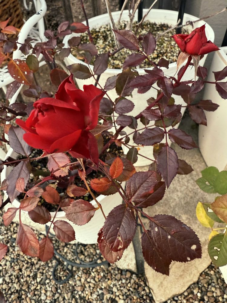 ミニバラ、寒さで葉っぱも真っ赤になってます