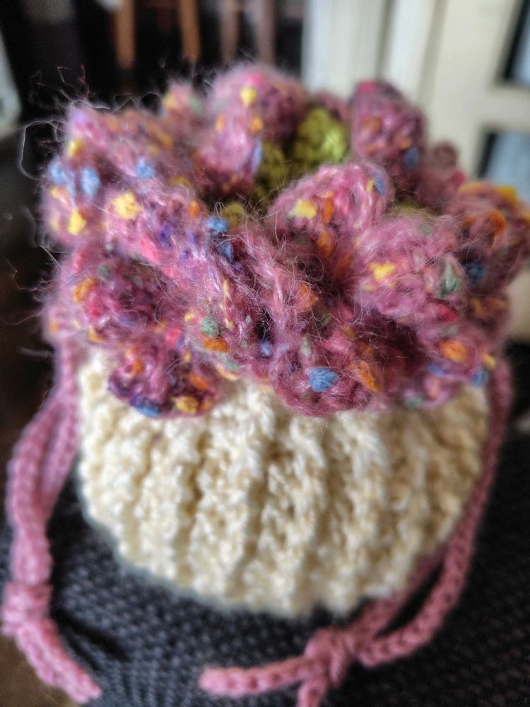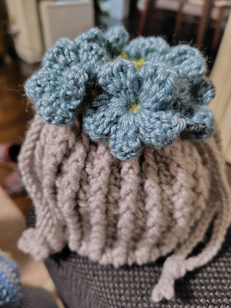 ④⑤今日は1日引きこもり…お花のついたポーチを編みました🩵🩷💜