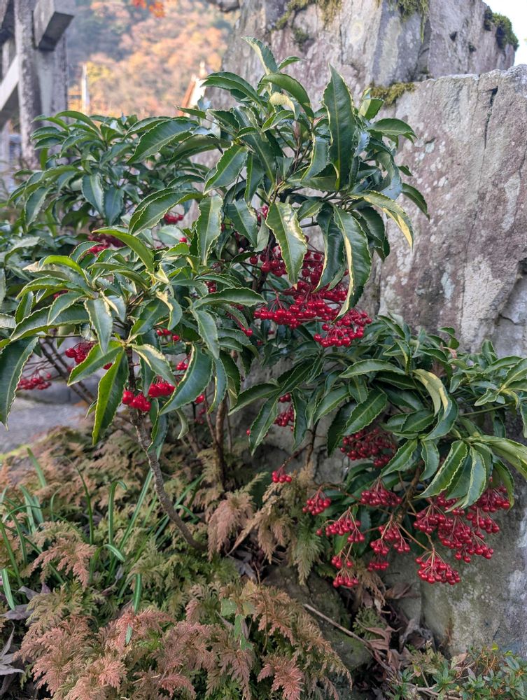 神社手前の人に家の手入れが行き届いた庭で万両と神社の百両を撮らせていただきました