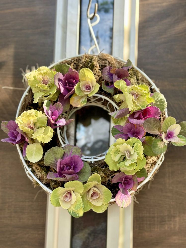 ①しめ飾りをかけていた玄関ドアには葉牡丹のリース