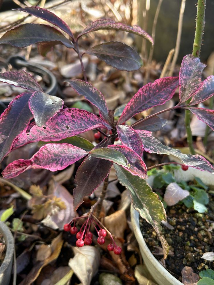 ①②は万両紅孔雀がピンクの葉っぱで可愛い