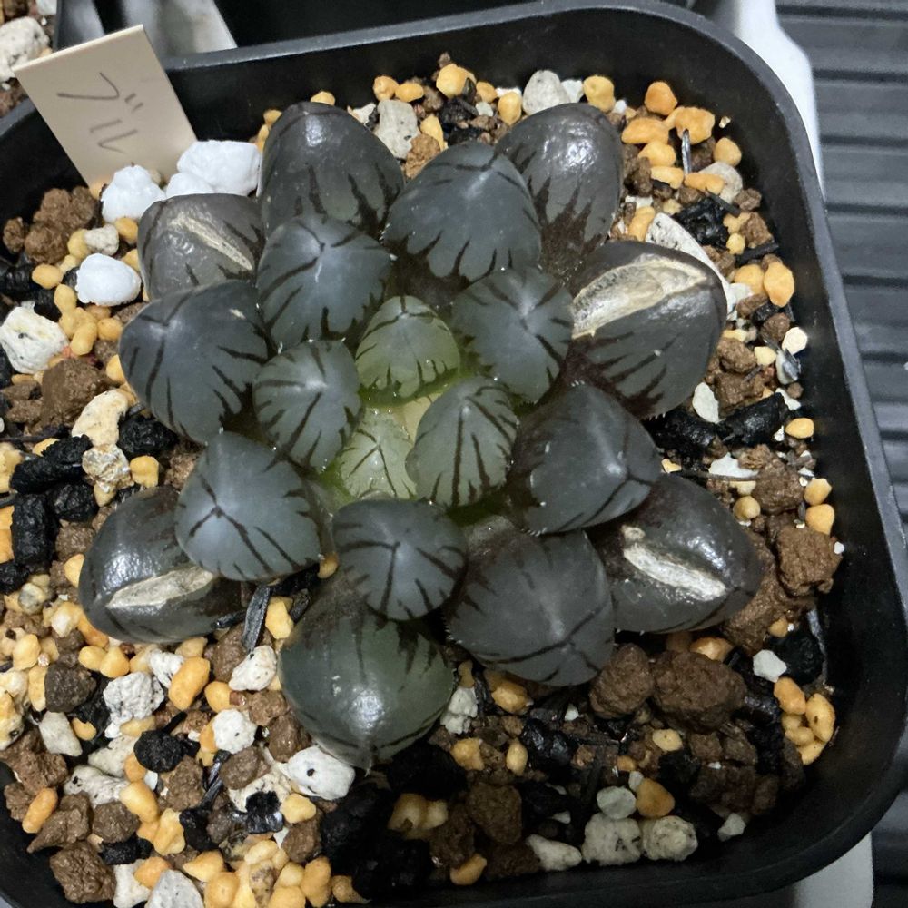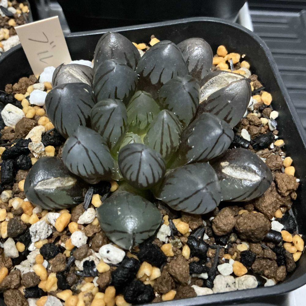 コーデックス師匠と仰ぐGS 友さんへパキプス君をお届けがてら、1年ぶりの二和園へ🚗💨 師匠のお友達と4人でハウスの中を行ったり来たり⇄ 植欲増進中の私は購入🈲️ルールなんて無視💦 ずっと気になっていた子たちをGETしてきました😊 植物名: 瑠璃殿錦 学名 :Hawworthia limifolia f.variegata 英名 :Fairy Washboard 科名 :ユリ科 属名 :ハオルチア属 原産地: 南アフリカケープ州 流通名: 瑠璃殿錦 生育型: 春秋型