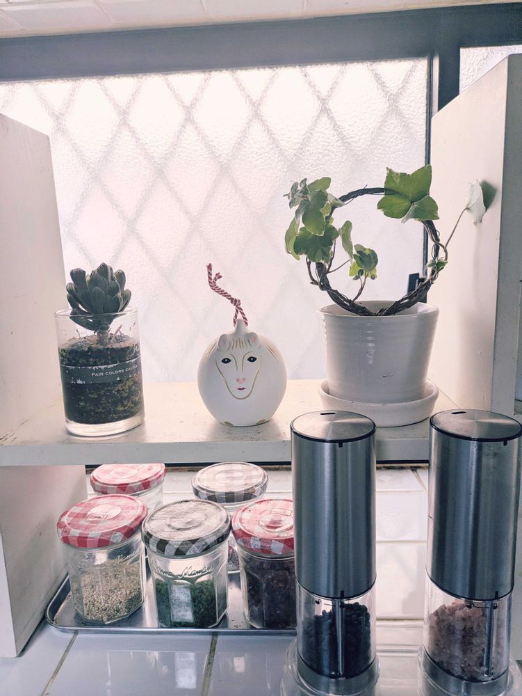 キッチンの出窓にアイビーとハオルチアオブツーサ