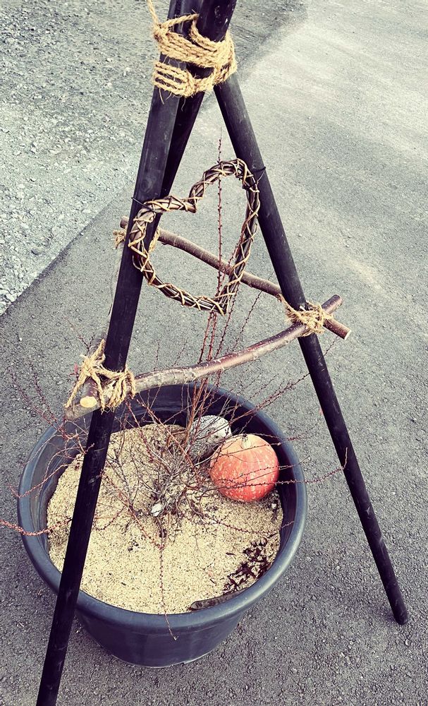 綺麗な紅葉は散ってしまい、春に向け花芽を蓄えている雪柳の保護となんか寂しい鉢植えの装飾に自作した支柱です。ロープワークは何度やっても身につかない、、無理やり括ったけどそれなりの強度はあるはず。
