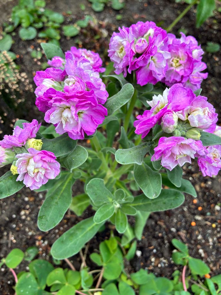 夕暮れ時、道路沿いの花壇にて、「八重咲きストック」を始め色んなお花をパチリ!📸🩷🌸🤍🌿😄🤗🌇✌️