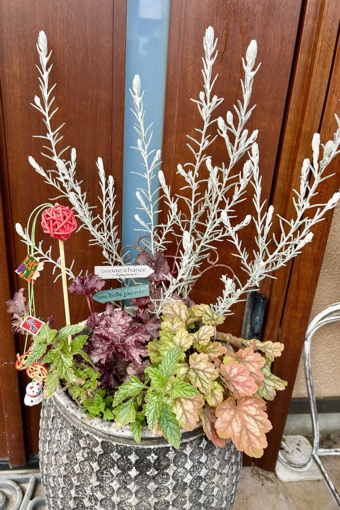 玄関前のヒューケラ寄せ植えを解体&株分してエレモフィラとスーパーベナを新しく入れました☺️