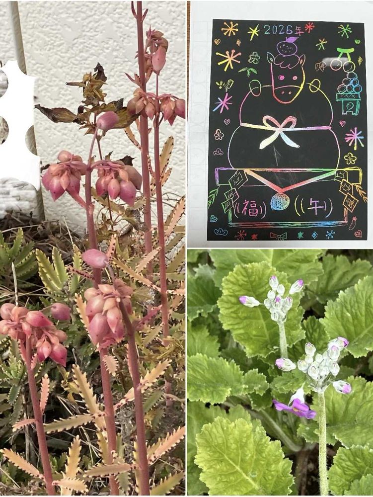 午年の絵、上手に描けてますね。双子ちゃんですか?可愛い♥自分年女です。女の子の孫2人、初めての年女です。私の還暦に誕生しました。お花たくさん、ルクリアの蕾が可愛いですね。
