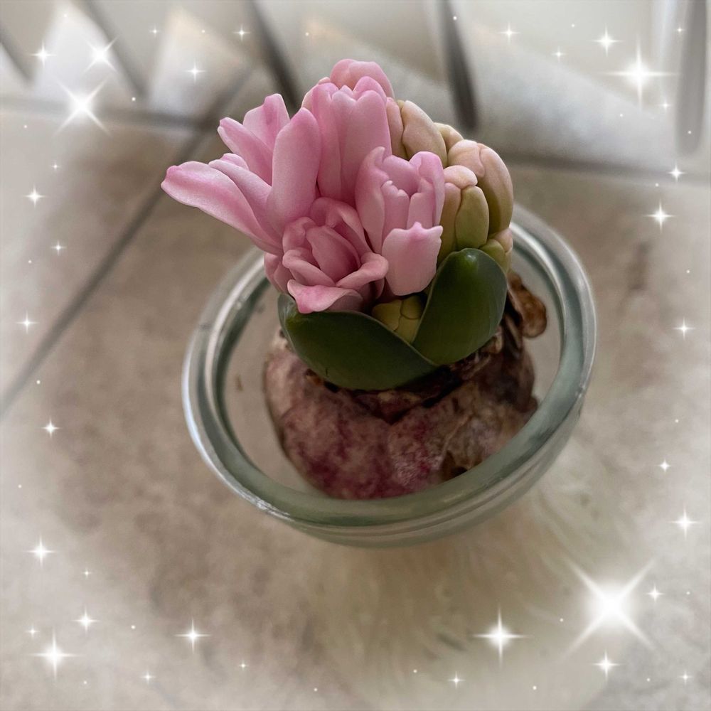 ヒヤシンス〜🩷かわいいピンク色が出てきました♬もう一つあるんですよ〜それは何色かお楽しみ〜😆♬