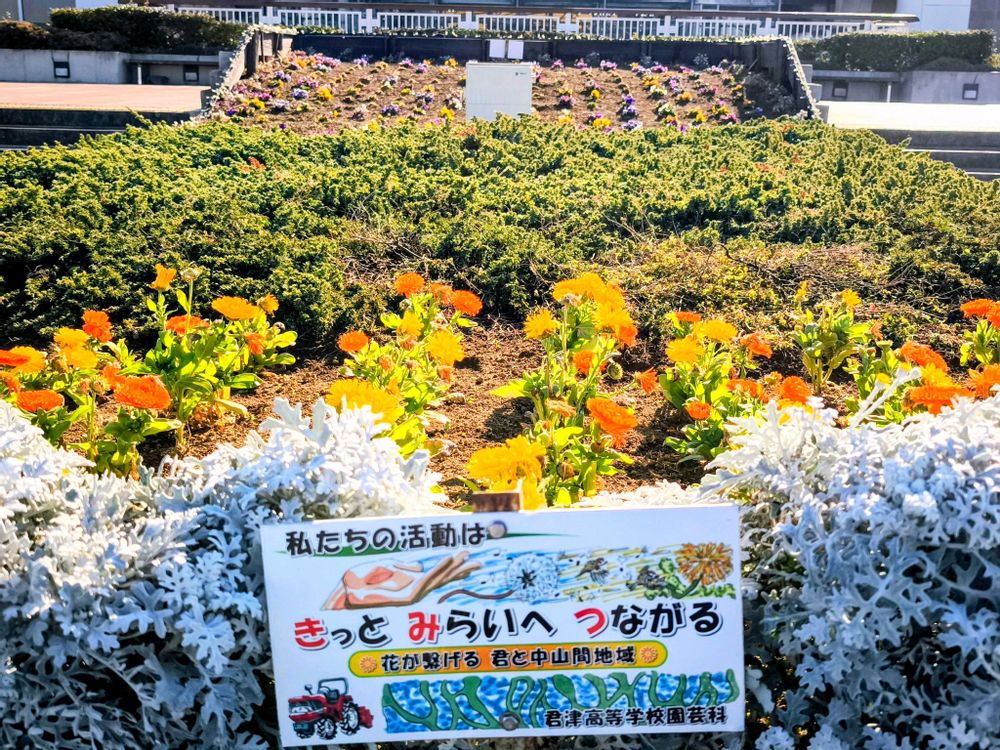 アクアラインの海ほたるパーキングエリアの花壇にはキンセンカでしょうか、先月12月4日に投稿した君津高校園芸科の生徒さんたちが植えたお花が咲いていました✨