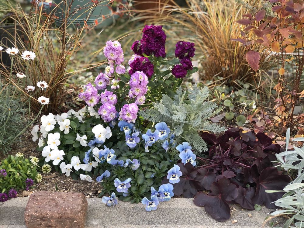 ①花壇は今年はビオラに合わせてブルー系にしたつもりが、紫系のストックがなんか浮いてる😭