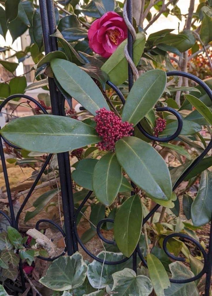 スキミア “ルベラ” & 椿☺️いい色だなぁ。