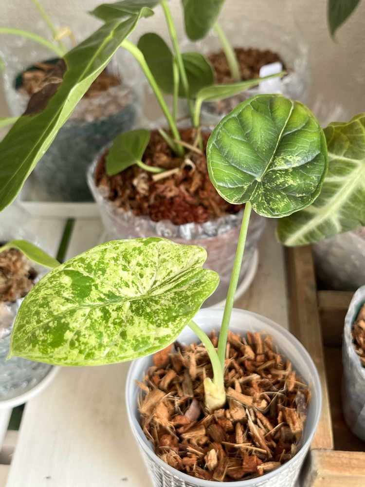 2025.8月に某サイトで購入した【アロカシア チャイ】の 突然変異?なんだろう環境の変化なのか。 購入時、元々有った葉を(1枚目の葉)として、 下から新たな葉が出てきてる状態で到着しました(2枚目の葉) こちらに来て初めて出てきた葉に異変が。。 育て始めて出てきた初めての3枚目、4枚目 (途中から、斑1、斑2、、と続きます) どこまでこの謎の斑入葉が続くのか、 いや止まるのか……記録していきます