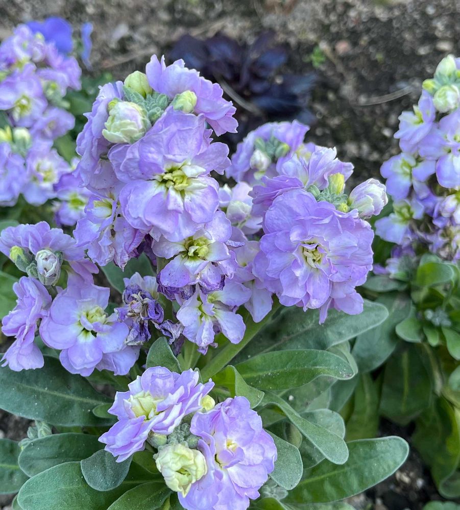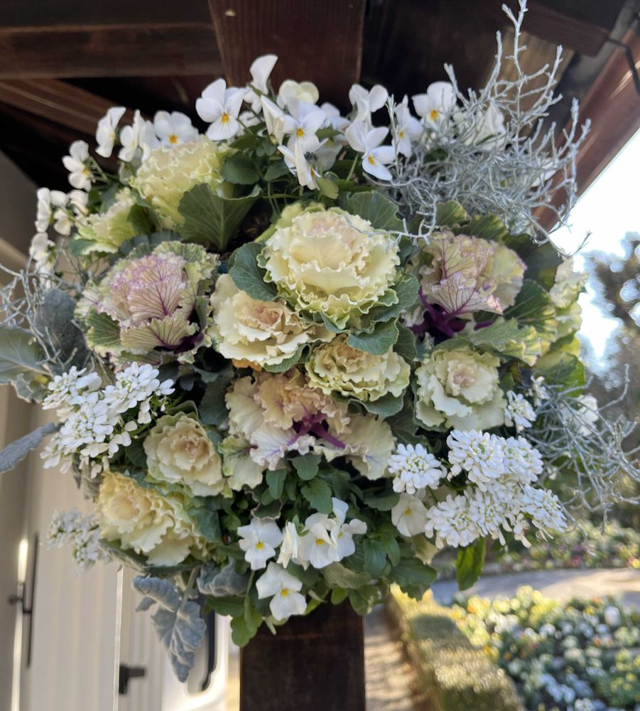 葉牡丹のハンギングが華やかです。今日の花ストック、うつむき加減のクリスマスローズ、柔らかな色のシクラメン、どれも優しい色合いで穏やかな気持ちになります。