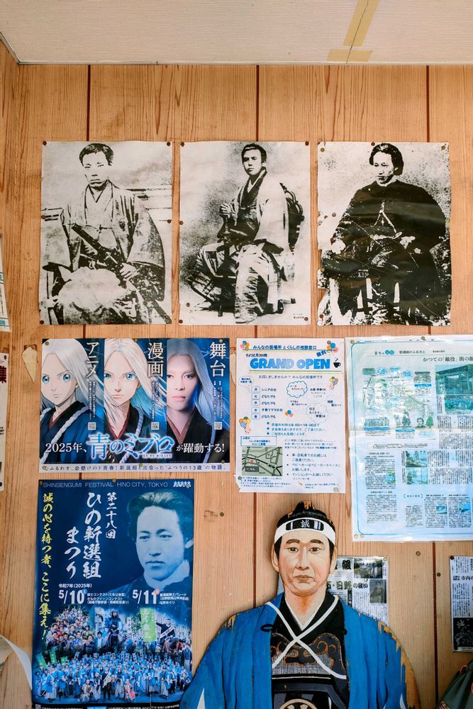 ④高幡饅頭のお店の横にセルフのお茶サービス場所があり、ベンチに新選組らしき人が座っていました、誰?