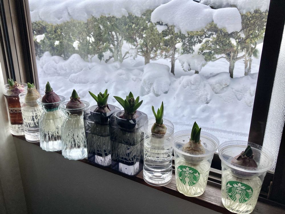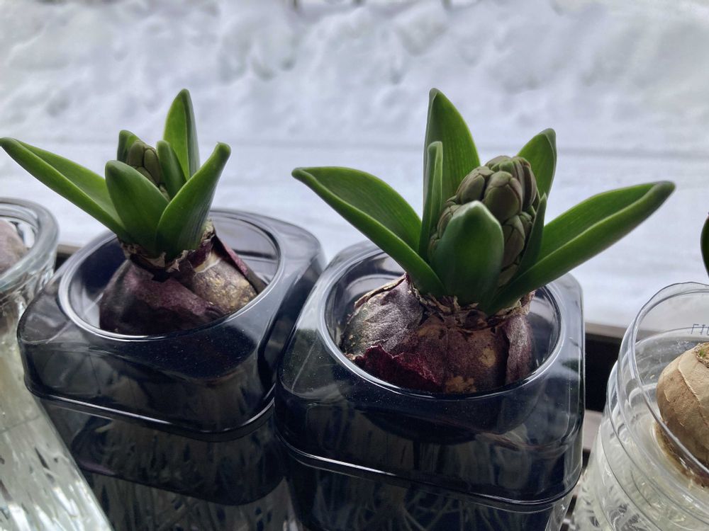 外は雪しかない こんな時期は室内の花が増えます😄 ヒヤシンス🩷🤍🩵成長が楽しみですね