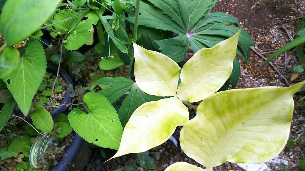 手前が黄金葉のムサシアブミです。多分、最高芸ではと思います。枯れるまで輝いています。